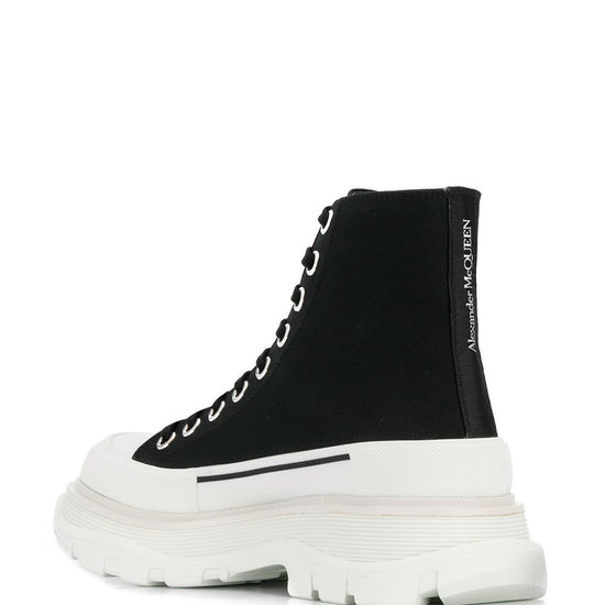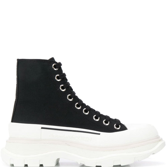 Nothing puts a spring in your step like a brand new pair of shoes. you'll look for every excuse to wear these lace-up chunky trainers from alexander mcqueen. with a platform rubber sole, they'll give you a much-needed boost as well! featuring a front lace up detail, a platform sole, an ankle length and a rubber sole. tread slick ankle boots size and fit - heel 2 in / 5 cm