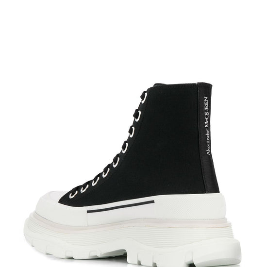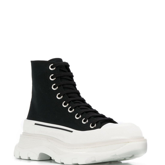 Nothing puts a spring in your step like a brand new pair of shoes. you'll look for every excuse to wear these lace-up chunky trainers from alexander mcqueen. with a platform rubber sole, they'll give you a much-needed boost as well! featuring a front lace up detail, a platform sole, an ankle length and a rubber sole. tread slick ankle boots size and fit - heel 2,2 in / 5,5 cm; platform 1,2 in / 3 cm