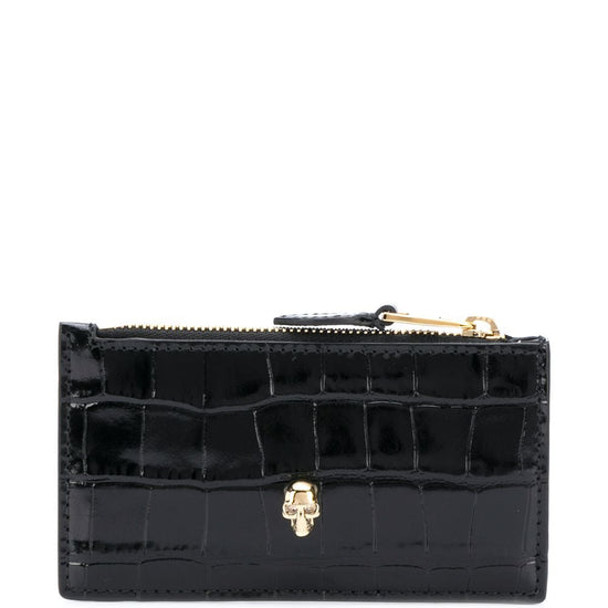 Black leather skull flat zip purse from alexander mcqueen featuring skull stud detailing, embossed crocodile effect, gold-tone logo lettering, top zip fastening and card slots. skull zipped leather credit card case size and fit - width 5,12 in / 13 cm