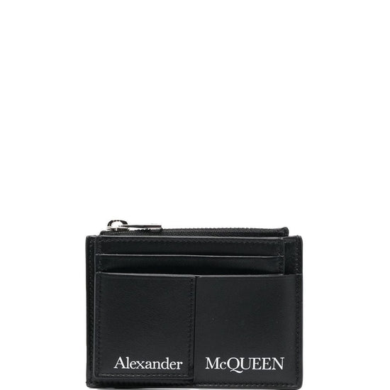 Logo print cardholder from alexander mcqueen featuring black/white, calf leather, logo print to the front, zip-fastening compartment and card slots. logo leather coin zip holder size and fit - width 4,72 in / 12 cm