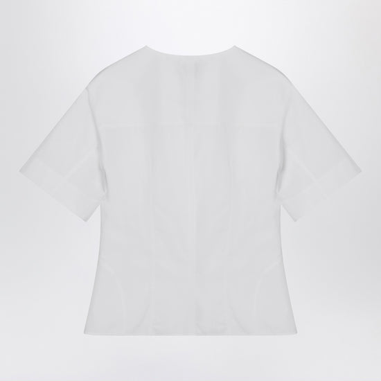 Alexander mcqueen white cotton poplin crew neck shirt, characterized by structured corset-style design, wide short sleeves, and hidden front closure. size and fit - model wears size 40 it model measurements: height: 179 cm chest: 82 cm waist: 65 cm hips: 90 cm