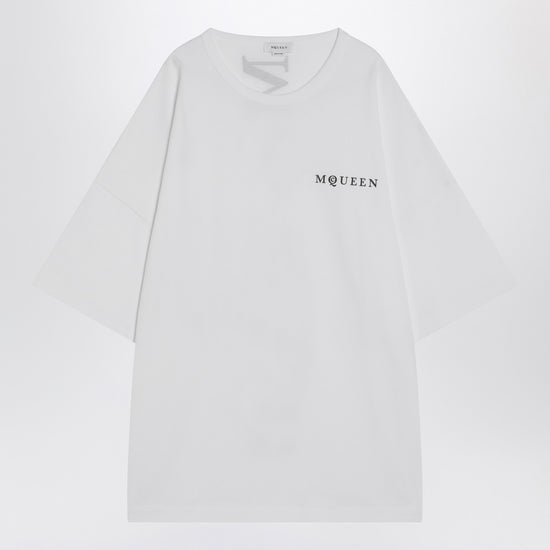 Oversized t-shirt by alexander mcqueen in white cotton, featuring logo print on the chest and back, short sleeves, and straight hem. size and fit - model wears size l model measurements: height: 189 cm chest: 104 cm waist: 78 cm hips: 95 cm