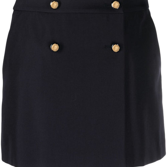 Wool-cotton blend mini wrap skirt from alexander mcqueen featuring navy blue, wool-cotton blend, twill weave, wrap design, embossed gold-tone buttons, high waist, front button fastening, straight hem and thigh-length. wool mini skirt size and fit - this piece fits true to size. we recommend you get your regular size. model is 1,75m / 5ft 8in wearing size 40 (it)