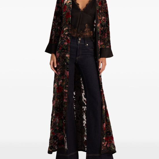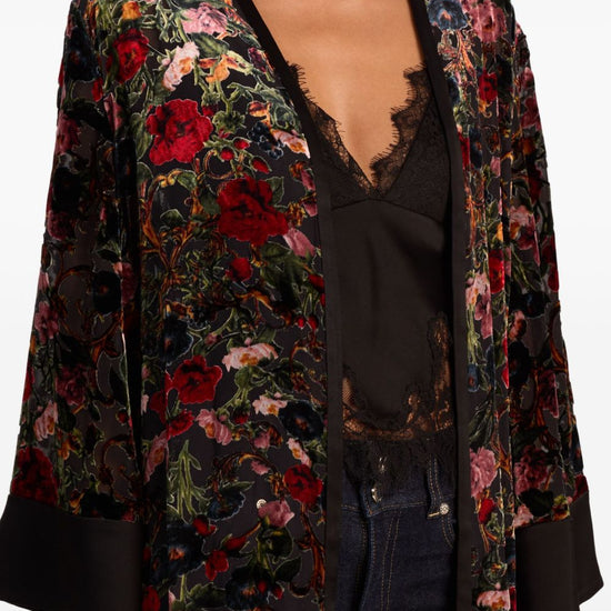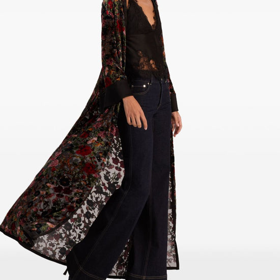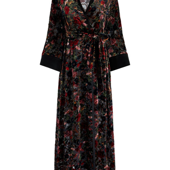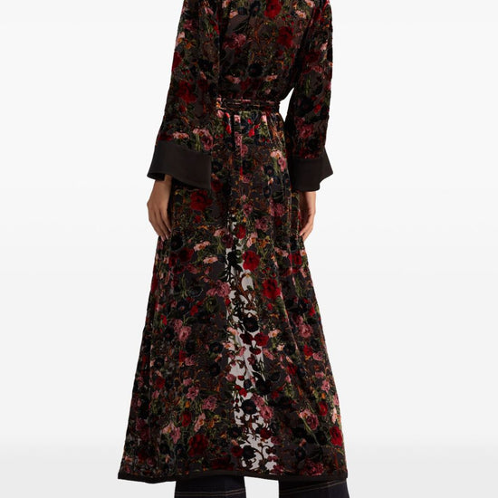 Black floral print belted long sleeves contrast cuffs v-neck nomi maxi kimono