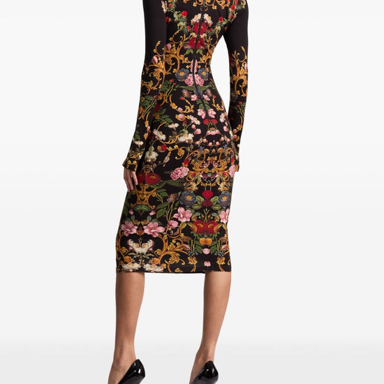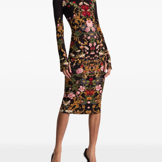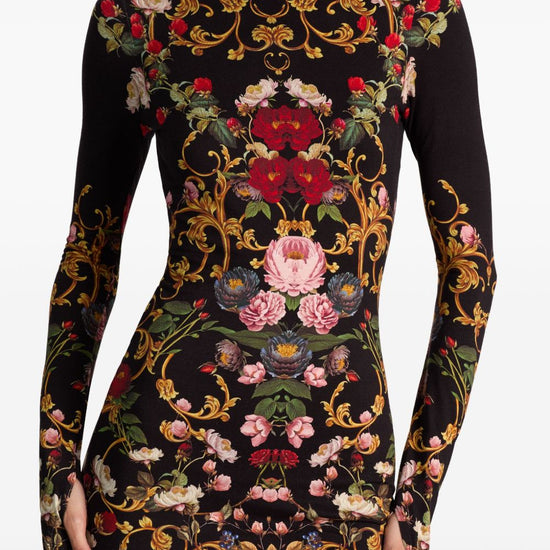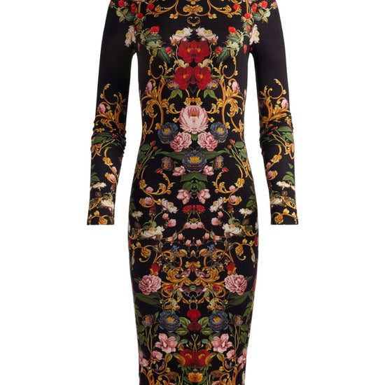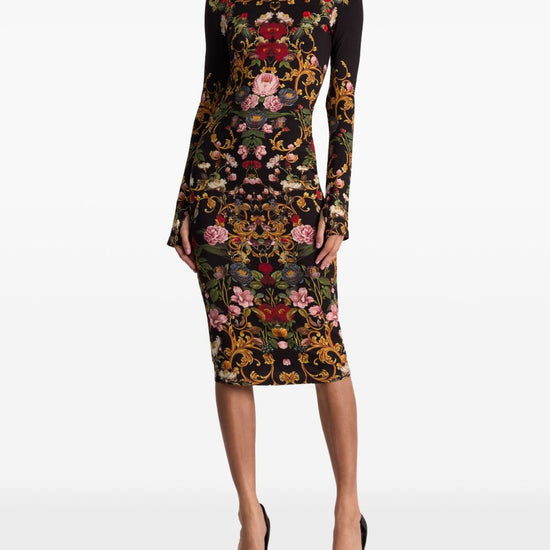 Black floral print long sleeves midi length turtleneck zip fastening delora long dress