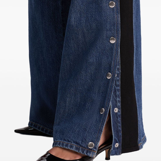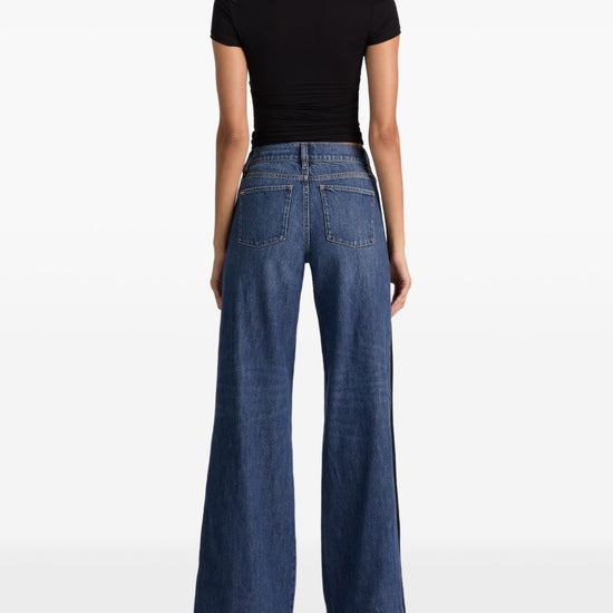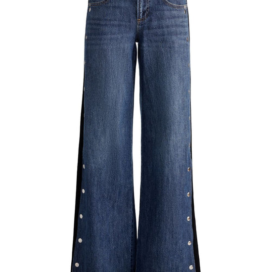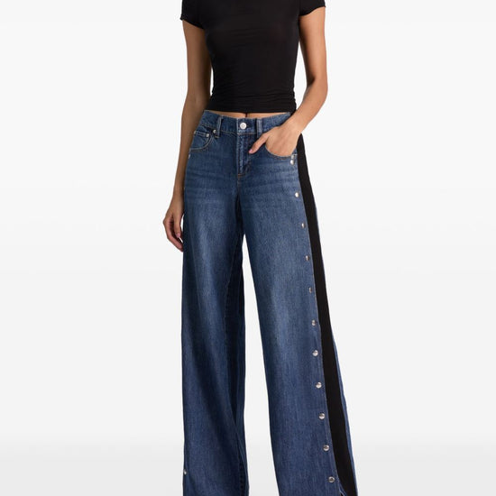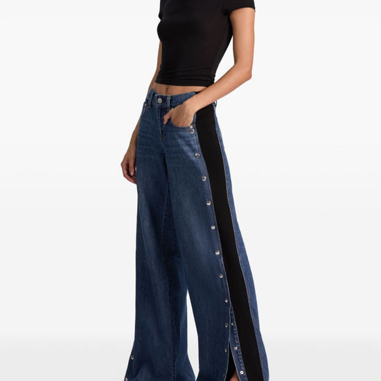 Blue button detailing black panel knit panel insert cotton flared leg denim jeans size and fit - .