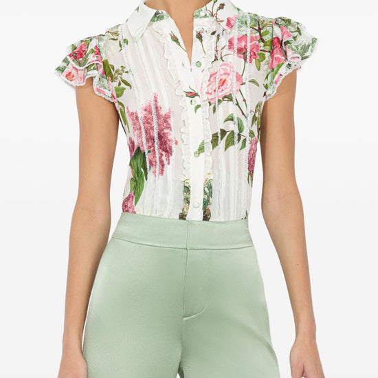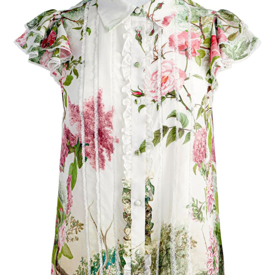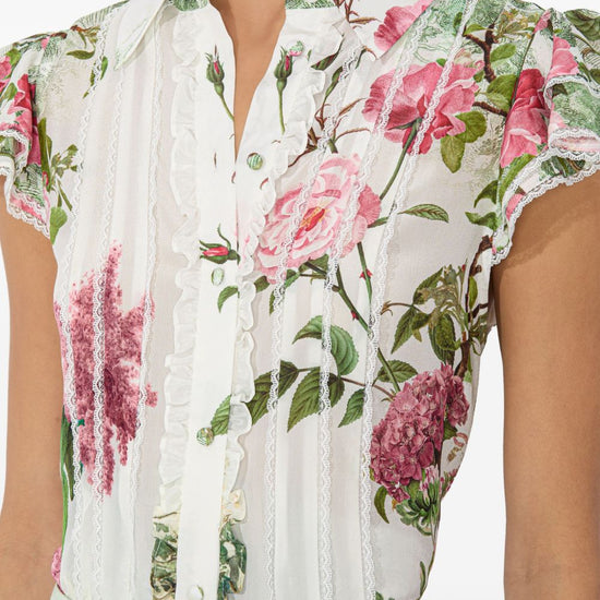 White front button fastening ruffled detailing lace trim all-over floral print short sleeves minda silk blouse size and fit - this piece fits true to size. we recommend you get your regular size. model is 1,75m / 5ft 8in wearing size s
