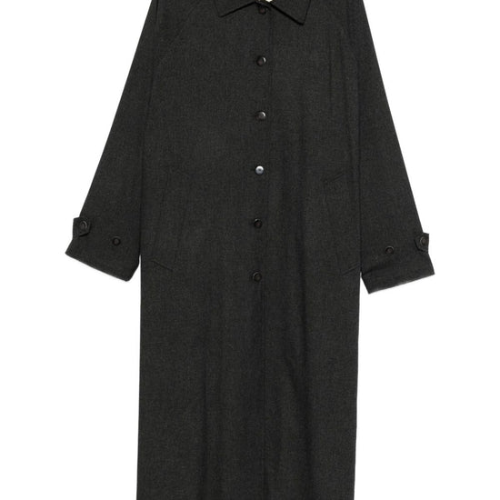 Charcoal grey colour, raglan sleeves, button fastening, collared neckline, welt pockets. oversized trench coat