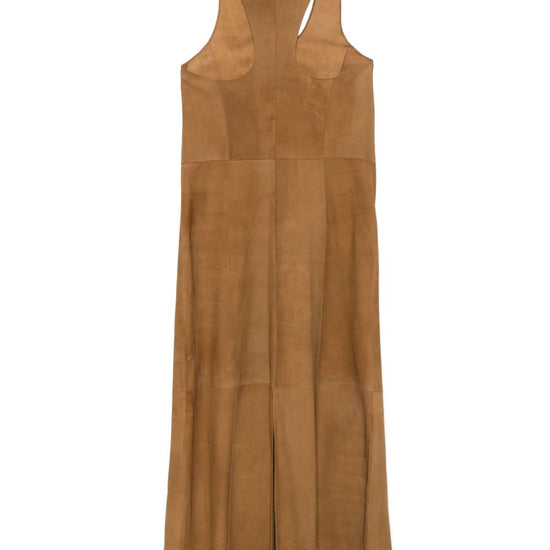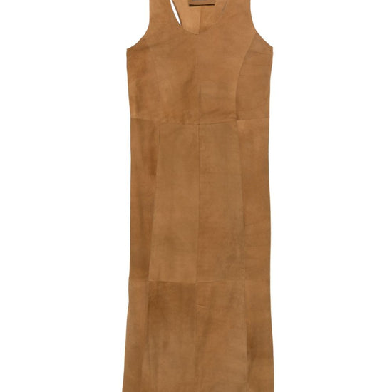 Caramel brown v-neck wide shoulder straps sleeveless pleated skirt suede midi dress size and fit - this piece fits true to size. we recommend you get your regular size. model is 1,75m / 5ft 8in wearing size 40 (it)