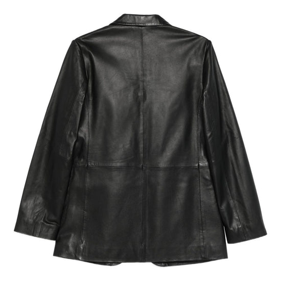 Black, leather, notched lapel, long sleeves. wool single-breasted jacket