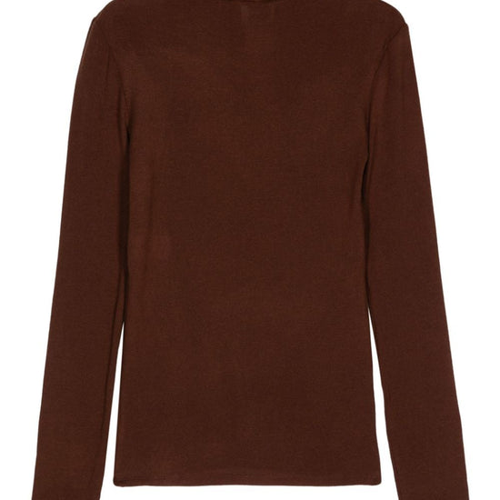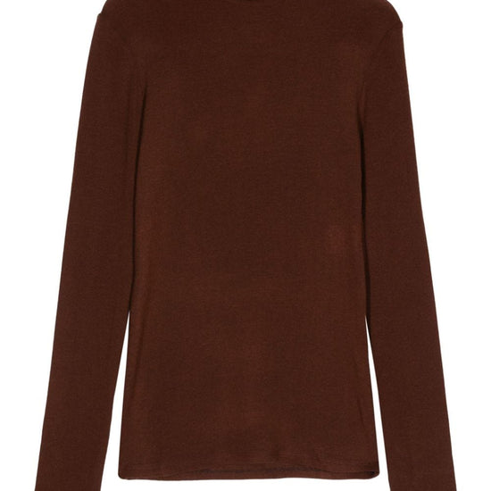 Chocolate brown fine knit turtleneck long sleeves straight hem wool blend turtleneck sweater size and fit - this piece fits true to size. we recommend you get your regular size. model is 1,75m / 5ft 8in wearing size 40 (it)