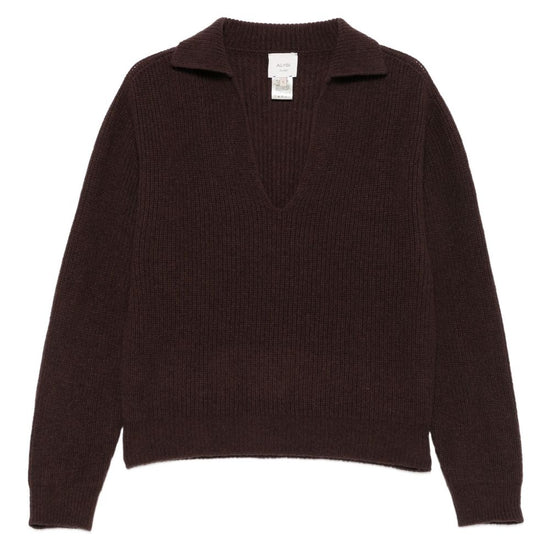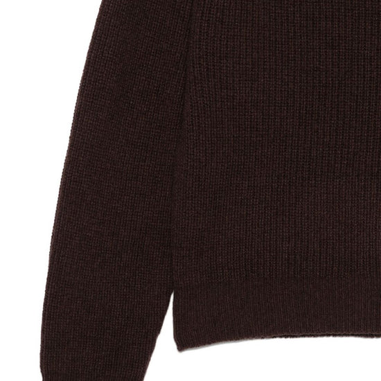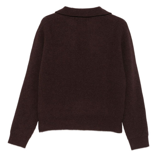 Brown, ribbed knit, polo neck, long sleeves. wool polo sweater