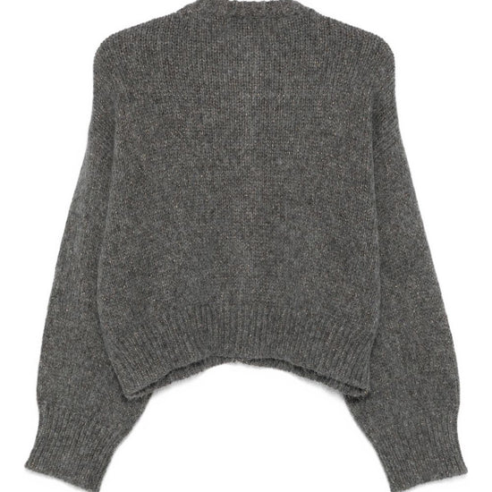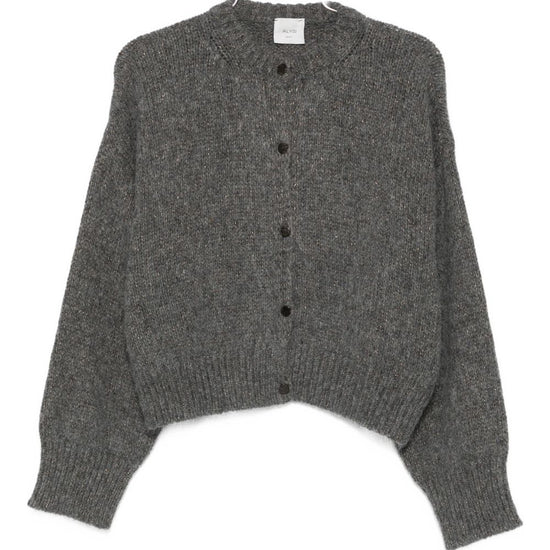 Dark grey, front button fastening, long sleeves, ribbed cuffs. crewneck cardigan