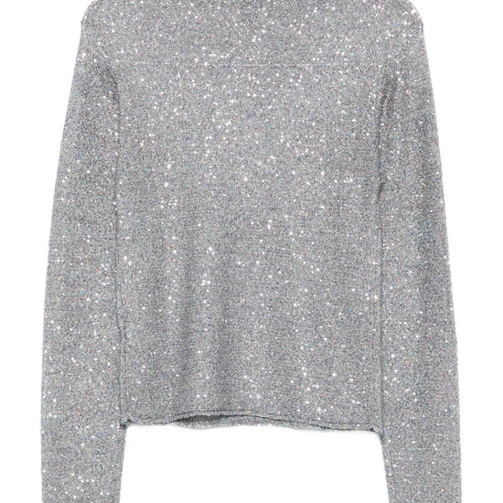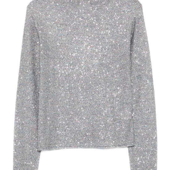 Silver-tone, mock neck, long sleeves, sequin embellishment, fine knit. turtle-neck sweater