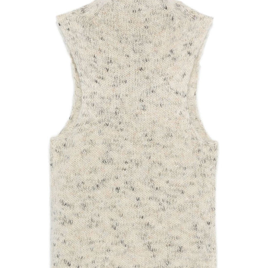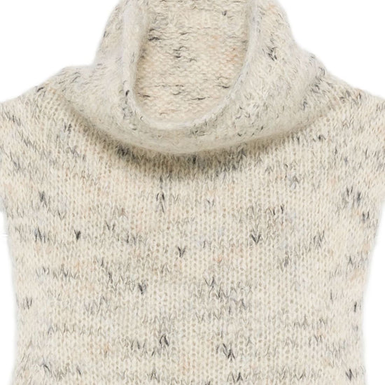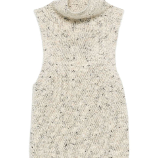 Beige, turtleneck, sleeveless, speckled pattern. wool turtle-neck top