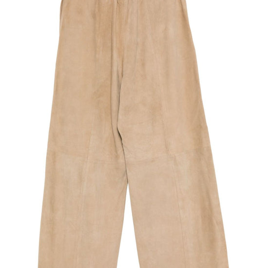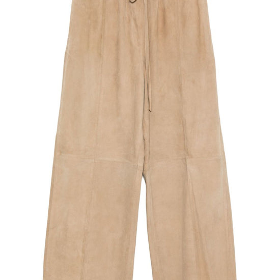 Beige, suede, drawstring waist, straight hem. suede leather trousers