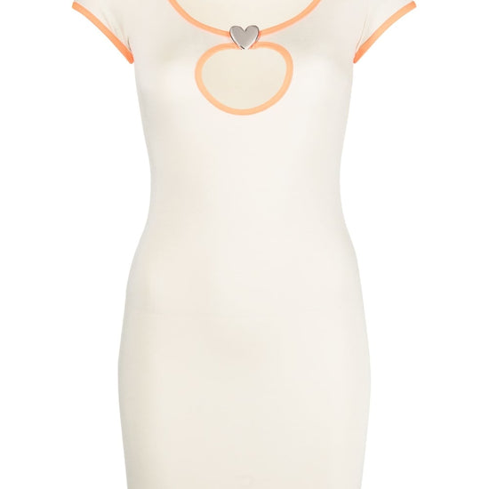 Cut-out t-shirt minidress from ambush featuring almond beige, stretch-design, contrasting trim, heart charm, cut-out detailing, scoop neck, short sleeves and thigh-length. cut-out, profili in contrasto cut-out mini dress size and fit - this piece fits true to size. we recommend you get your regular size. model is 1,75m / 5ft 8in wearing size s
