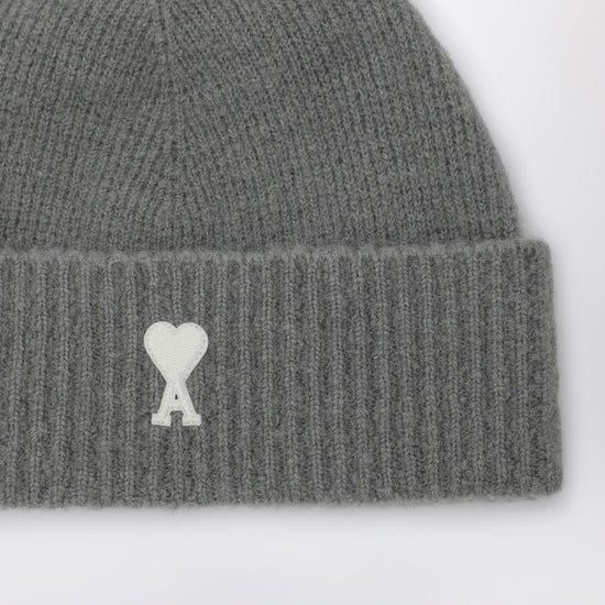 Ami paris gris wool beanie, characterized by a ribbed texture and a turned-up hem with a white ami de coeur patch.