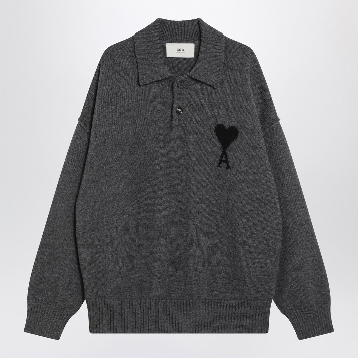 Ami paris heather grey wool polo sweater, featuring long sleeves, dropped shoulders, ribbed edges, buttons on the front, and a contrasting ami de coeur logo intarsia on the chest. size and fit - model wears size l model measurements: height: 187 cm chest: 102 cm waist: 76 cm hips: 92 cm