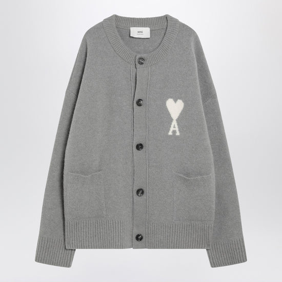 Ami paris grey wool cardigan, featuring ami de coeur embroidery on the chest, long sleeves, front button placket, round neckline, two front pockets, ribbed cuffs and hem. size and fit - model wears size x l model measurements: height: 189 cm chest: 104 cm waist: 78 cm hips: 95 cm