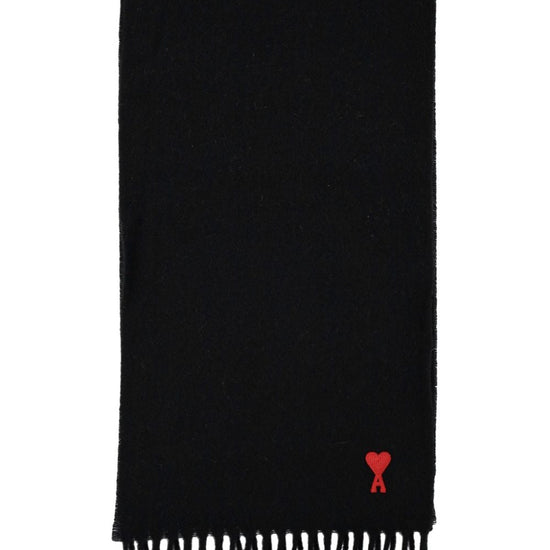 Core black wool signature ami de coeur monogram motif fringed edge wraparound style ami de coeur wool scarf size and fit - length: 190.0 centimetres. width: 25.0 centimetres.
