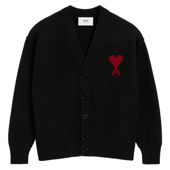 Black wool knit intarsia heart motif v-neck ami de coeur wool cardigan size and fit - this piece fits true to size. we recommend you get your regular size. model is 1,84m / 6ft 1in wearing size m