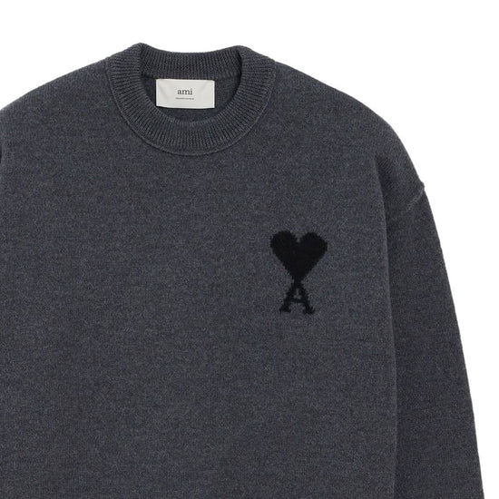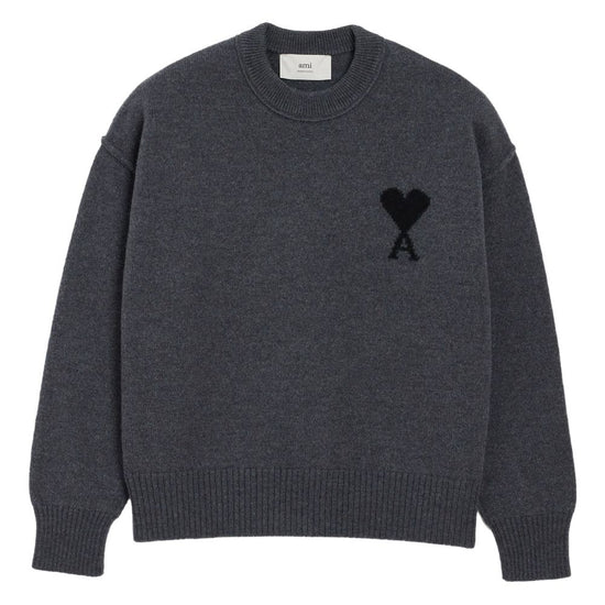 Anthracite grey crew neck long sleeves ribbed cuffs and hem intarsia-knit logo ami de coeur wool sweater size and fit - this piece fits true to size. we recommend you get your regular size. model is 1,84m / 6ft 1in wearing size m