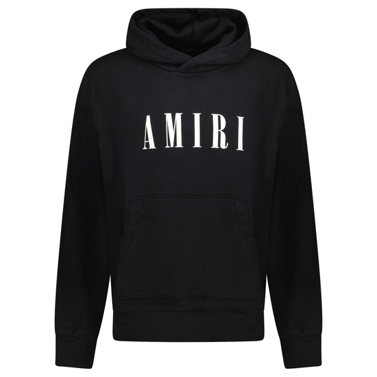 the amiri white core logo printed hooded sweatshirt in black showcases house iconography to enhance understated jersey essentials for easy outfitting. this hoodie features the core amiri logo prominently and is finished with a spacious kangaroo pocket. made from 100% cotton, it combines comfort with style for a versatile wardrobe staple.