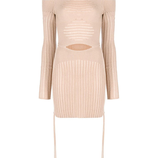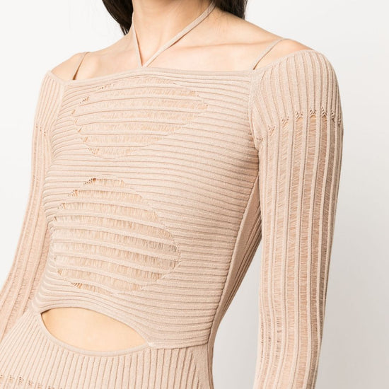 Ribbed-knit mini dress from andreadamo featuring blush beige, knitted construction, ribbed knit, cut-out detailing, semi-sheer panels, halterneck tie fastening, square open back, long sleeves, bodycon design, thigh-length and straight hem. knit ribbed mini dress size and fit - this piece fits true to size. we recommend you get your regular size. model is 1,75m / 5ft 8in wearing size s