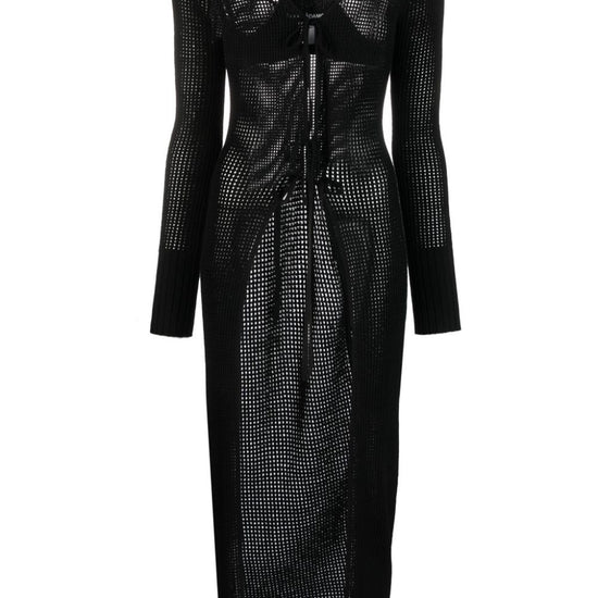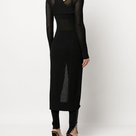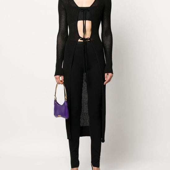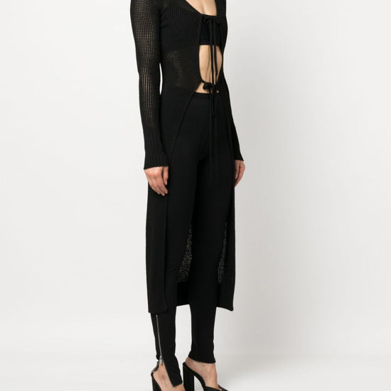 Semi-sheer racerback knitted cardigan from andreadamo featuring black, knitted construction, ribbed detailing, semi-sheer construction, racerback, front tie fastening, long sleeves, ribbed cuffs and hem, straight hem and long length. knit long cardigan size and fit - this piece fits true to size. we recommend you get your regular size. model is 1,75m / 5ft 8in wearing size s
