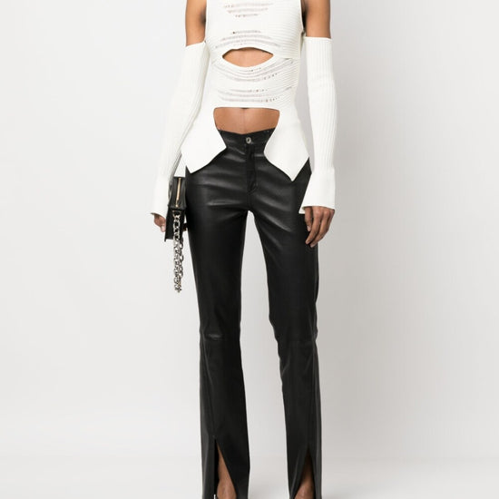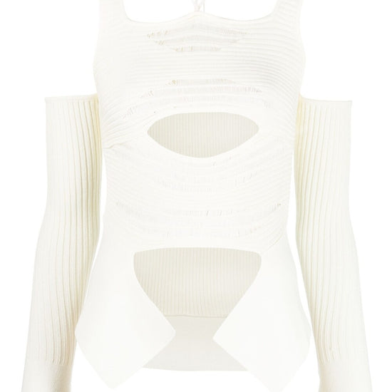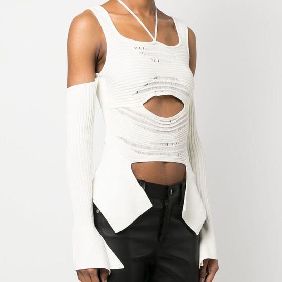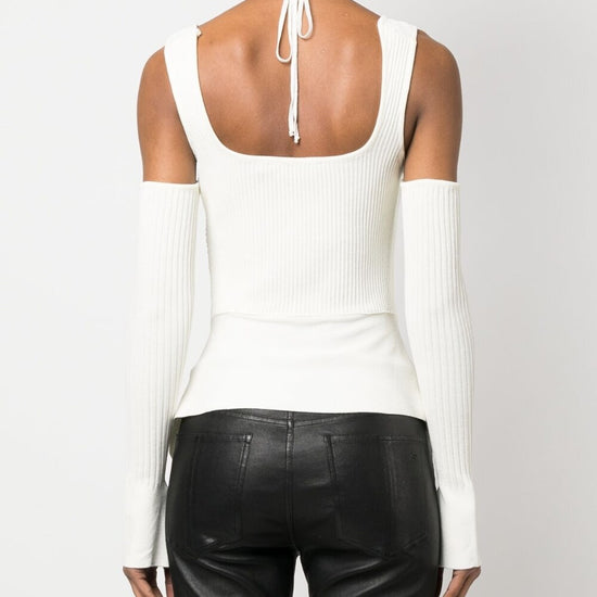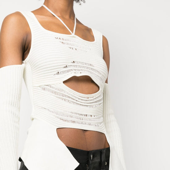 Cut-out detail ribbed knit top from andreadamo featuring ivory white, ribbed knit, distressed effect, cut-out detailing, wide shoulder straps, crop sleeves and halterneck tie fastening. knit ribbed top size and fit - this piece fits true to size. we recommend you get your regular size. model is 1,75m / 5ft 8in wearing size s