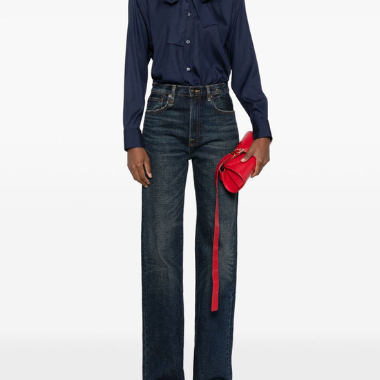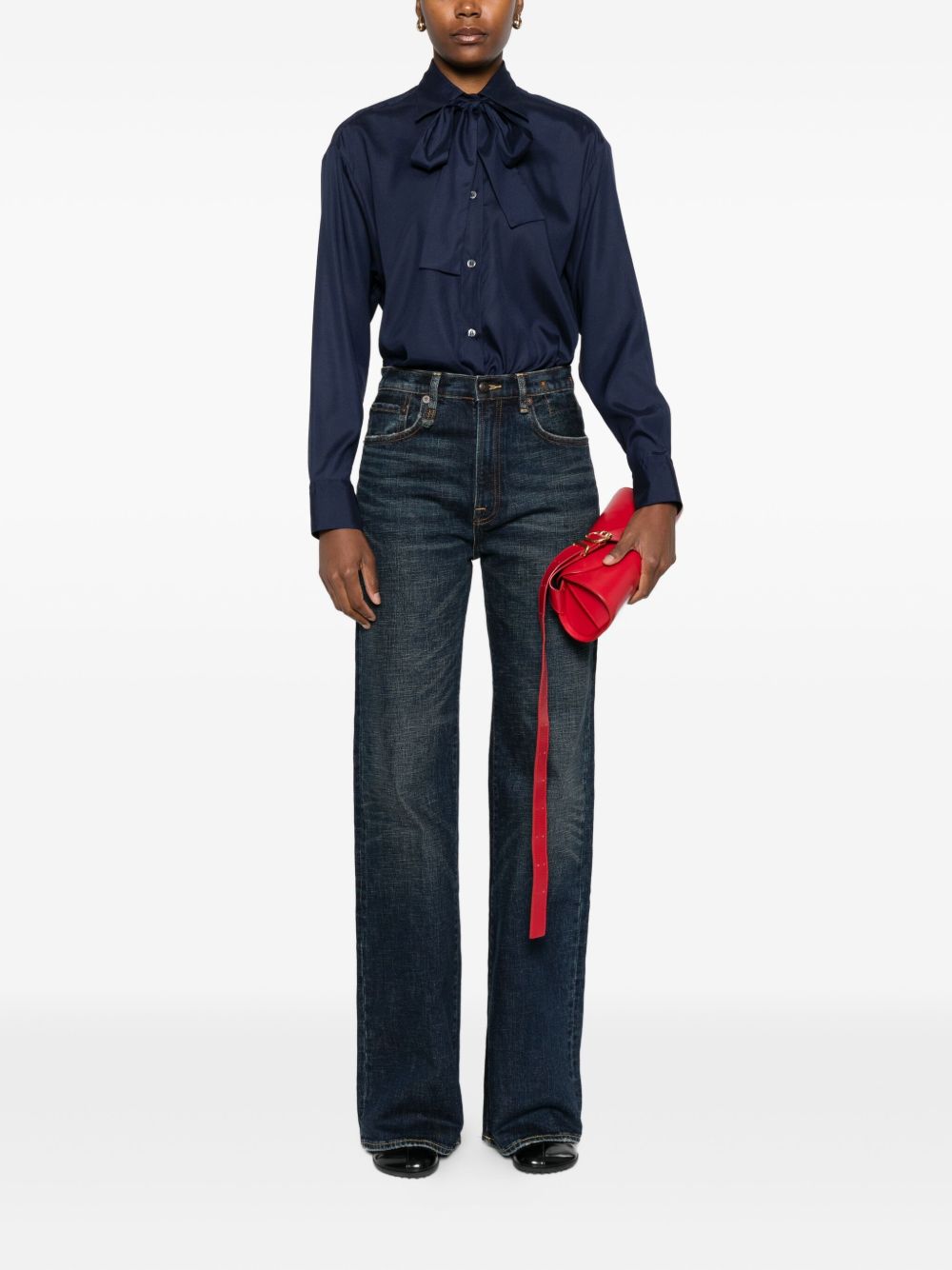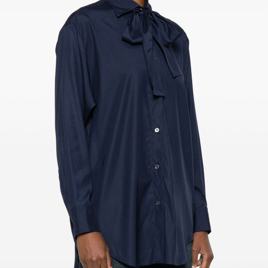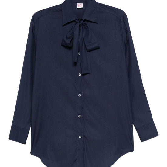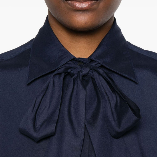 Navy blue silk button fastening long sleeves bow detail curved hem bow-tie silk shirt