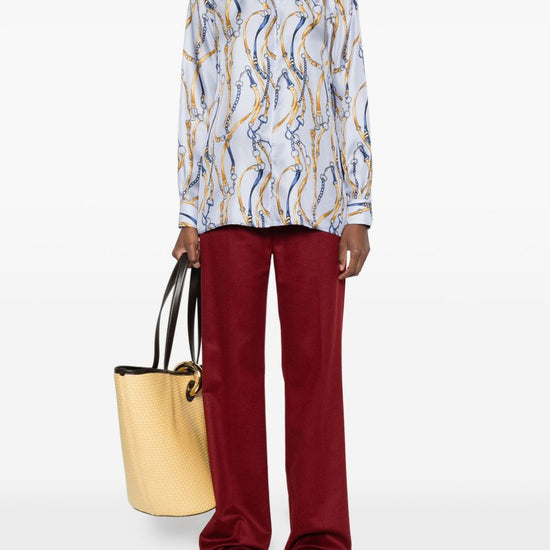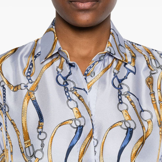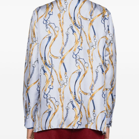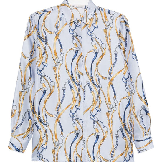 Light blue silk chain print long sleeves concealed button fastening printed silk shirt
