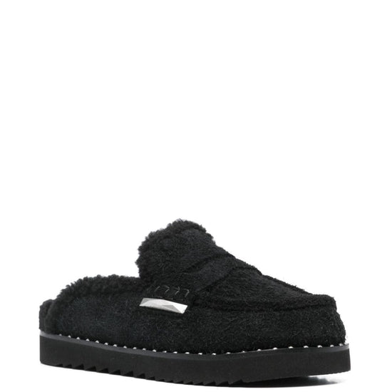 Black leather suede textured finish slip-on style penny slot almond toe branded insole faux-shearling lining rubber sole genda slippers size and fit - heel 1 in / 2,5 cm platform 0,8 in / 2 cm