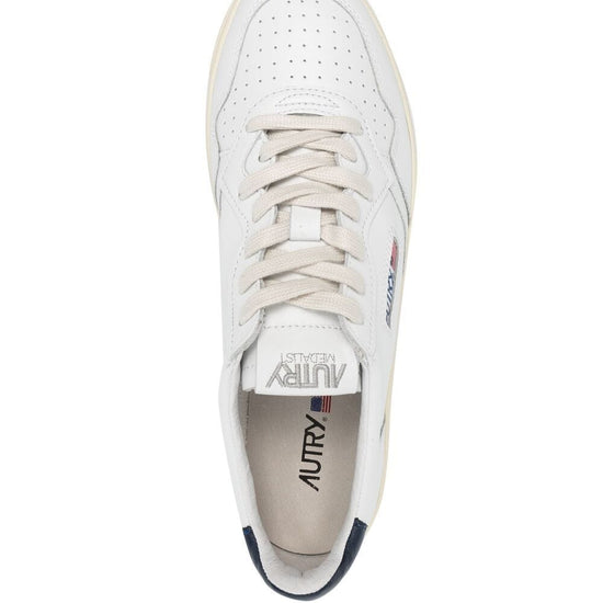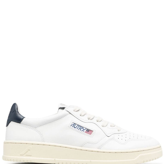 White/navy leather logo patch to the side logo patch at the tongue logo-embossed patch to the rear branded insole perforated detailing front lace-up fastening flat rubber sole medialist low sneakers