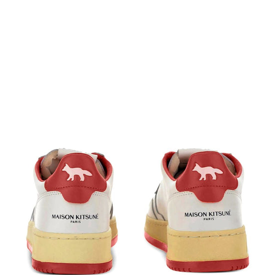 White leather upper fox logo perforated detailing red heel tab cream midsole red outsole medialist low sneakers