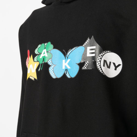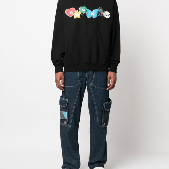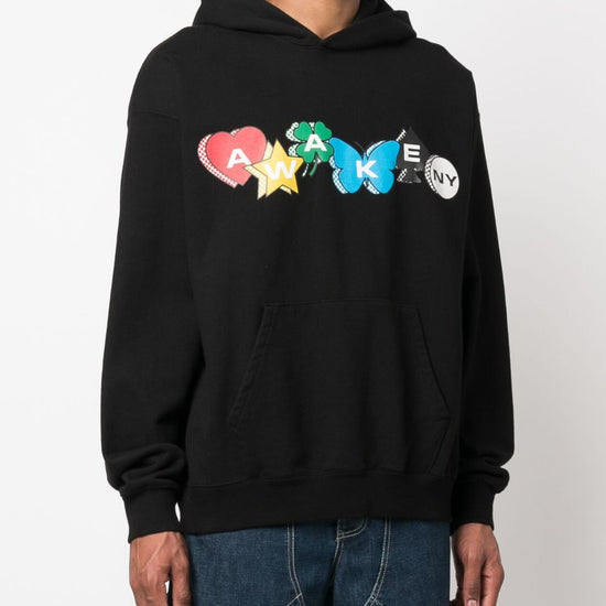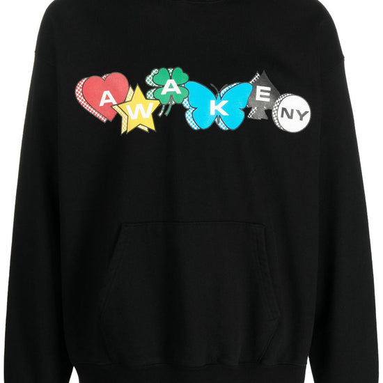 Graphic logo-print hoodie from awake ny featuring black, cotton, logo print to the front, long sleeves, elasticated cuffs, slouchy hood, front pouch pocket and straight hem. printed charm logo hoodie size and fit - this piece fits true to size. we recommend you get your regular size. model is 1,84m / 6ft 1in wearing size m