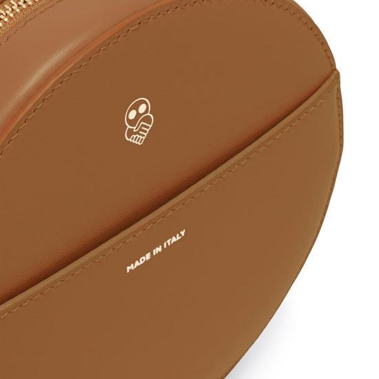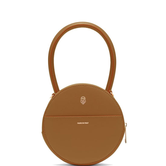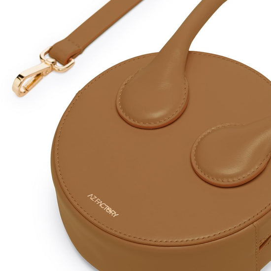 X ester manas round cake tote bag from az factory featuring camel brown, calf leather, logo stamp to the front, smooth grain, circular body, single circular top handle, top zip fastening, main compartment and detachable shoulder strap. rotonda round leather mini bag size and fit - width 5,91 in / 15 cm