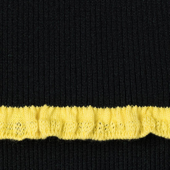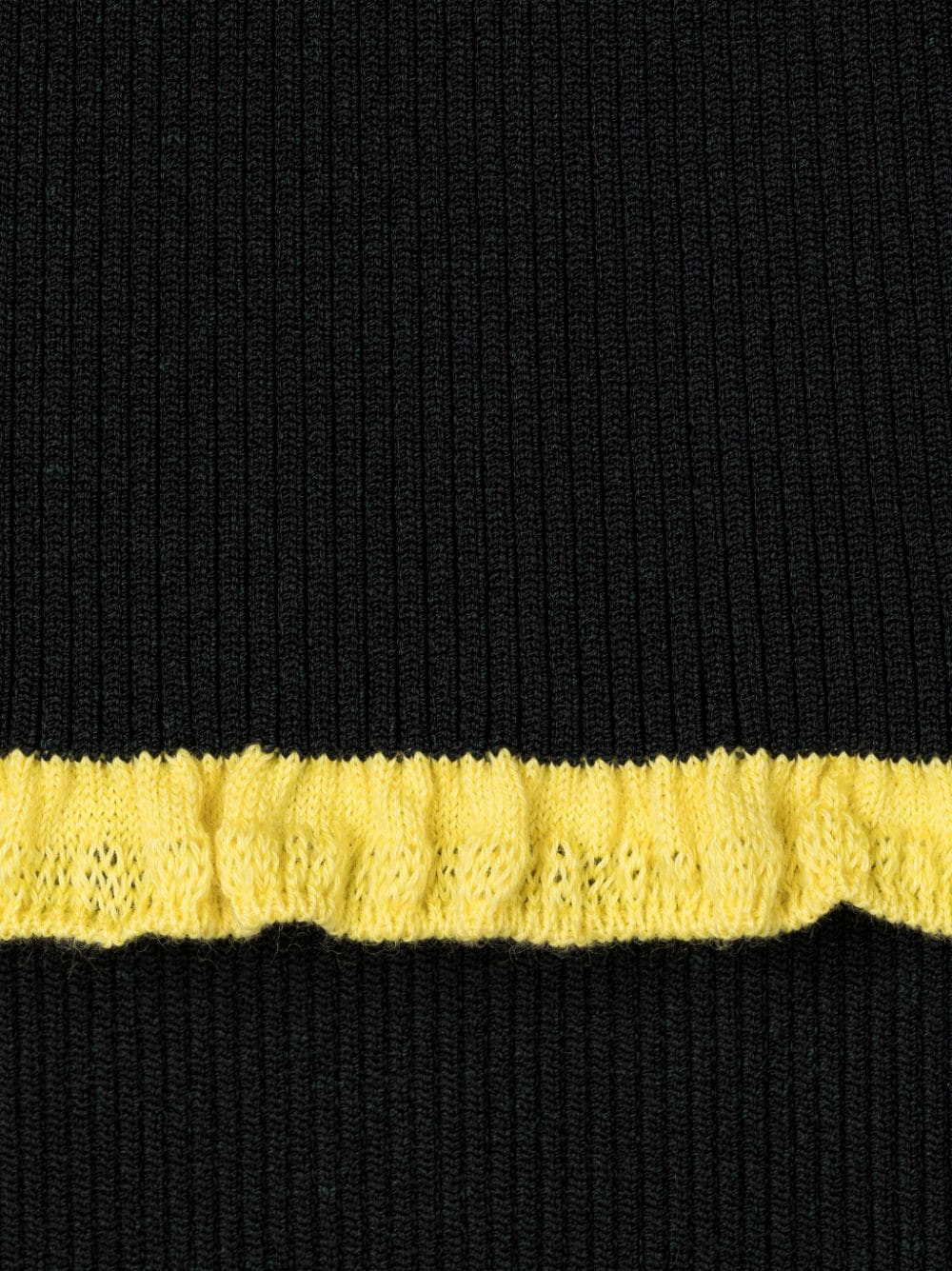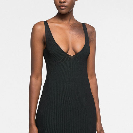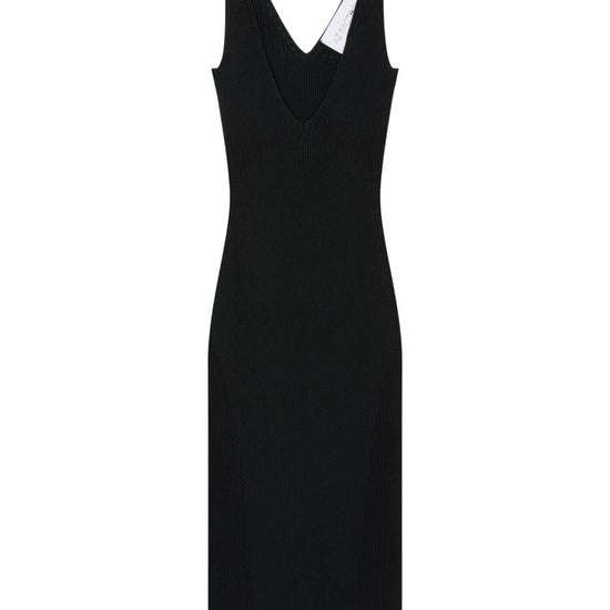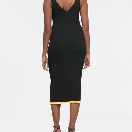 X ester manas v-neck ribbed midi dress from az factory featuring black, ribbed knit, plunging v-neck, thin shoulder straps, contrasting border and scallop hem. scollo profondo v-neck short dress size and fit - this piece fits true to size. we recommend you get your regular size. model is 1,75m / 5ft 8in wearing size s