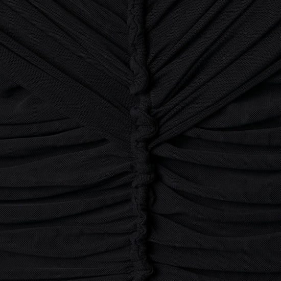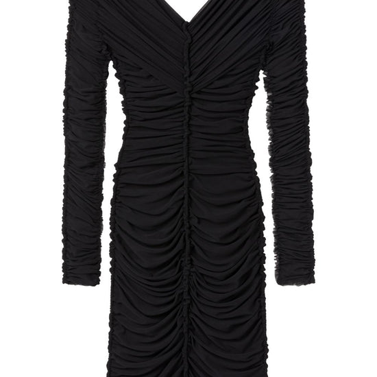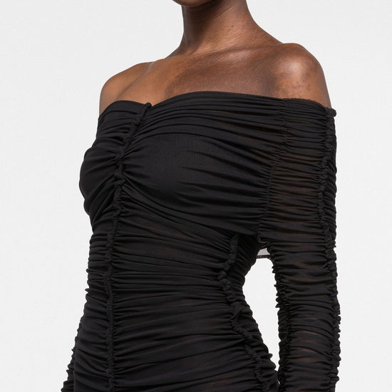 Ruched off-shoulder dress from az factory featuring black, stretch-design, off-shoulder, ruched detailing, ruffled detailing, long sleeves and thigh-length. v-neck short dress size and fit - this piece fits true to size. we recommend you get your regular size. model is 1,75m / 5ft 8in wearing size 36 (fr)
