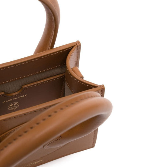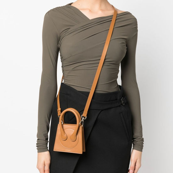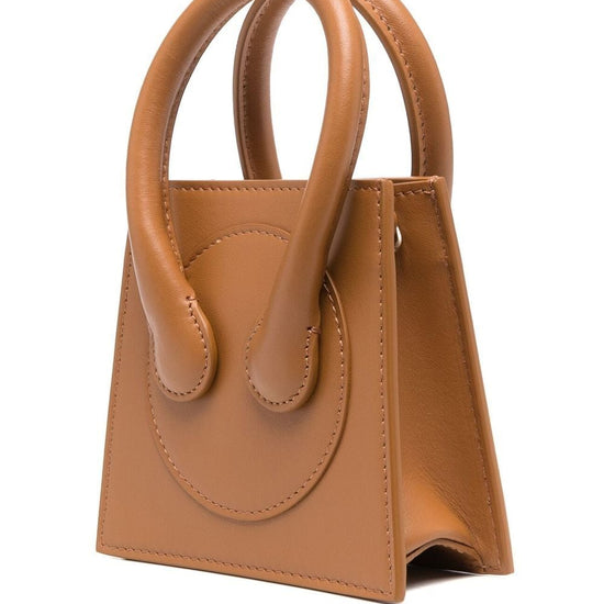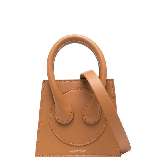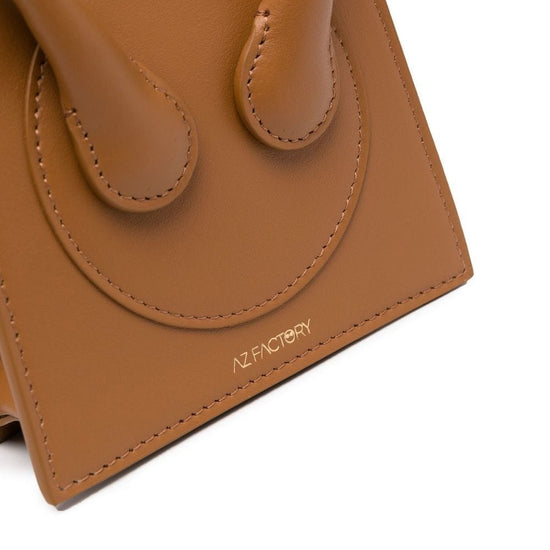 X ester manas small cake tote bag from az factory featuring logo stamp to the front, panelled design, two rolled top handles, adjustable detachable shoulder strap, main compartment, internal card slot, internal logo stamp, brown and calf leather. leather micro crossbody bag size and fit - width 4,72 in / 12 cm