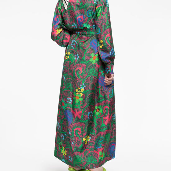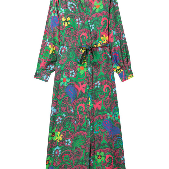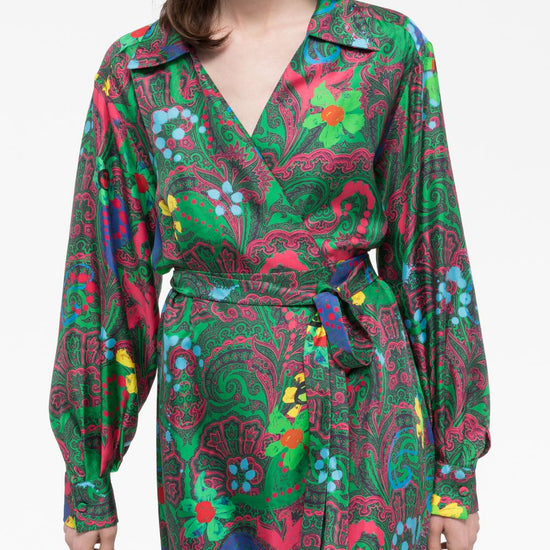 Motly paisley wrapped dress from az factory featuring multicolour, silk, paisley print, wrap design, classic collar, belted waist, long sleeves and mid-length. a portafoglio, cintura, stampa paisley paisley print long wrap dress size and fit - this piece fits true to size. we recommend you get your regular size. model is 1,75m / 5ft 8in wearing size 36 (fr)