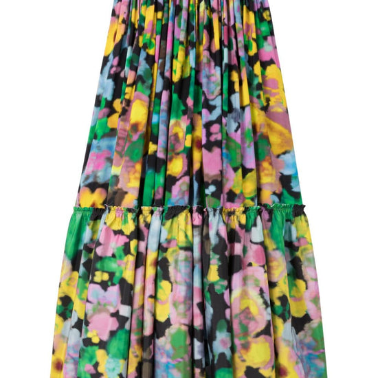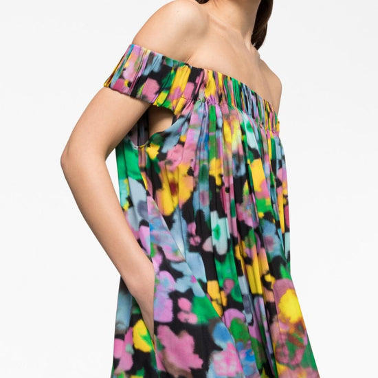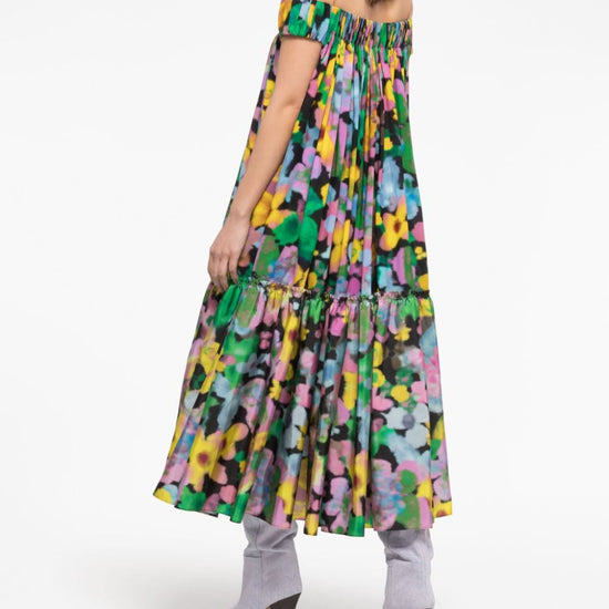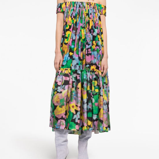 Gaia floral-print off-shoulder midi dress from az factory featuring black/multicolour, all-over floral print, off-shoulder, tiered skirt, crepe texture and mid-calf length. midi, spalle scoperte, 1 balza off shoulder midi dress size and fit - this piece fits true to size. we recommend you get your regular size. model is 1,75m / 5ft 8in wearing size 36 (fr)