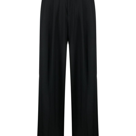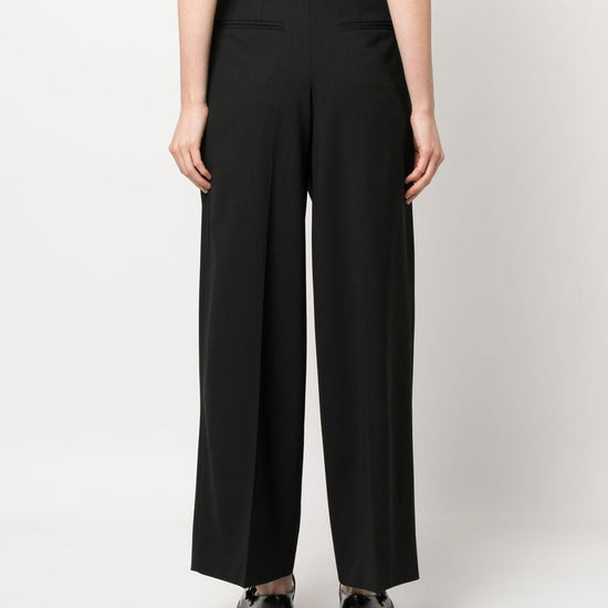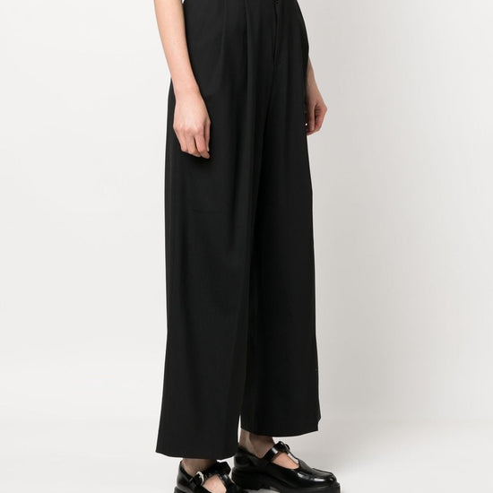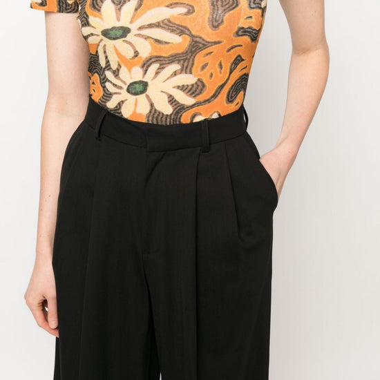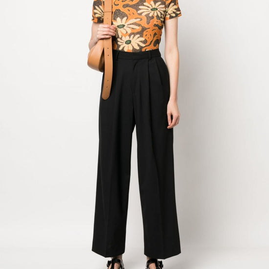 Alex wide-leg trousers from az factory featuring black, virgin wool blend, high waist, belt loops, concealed front fastening, pleat detailing, side pouch pockets, two rear welt pockets, wide leg and pressed crease. gamba larga wide leg wool trousers size and fit - this piece fits true to size. we recommend you get your regular size. model is 1,75m / 5ft 8in wearing size 36 (fr)
