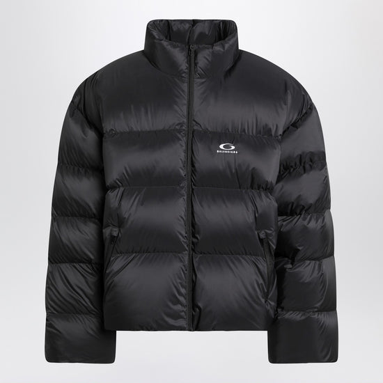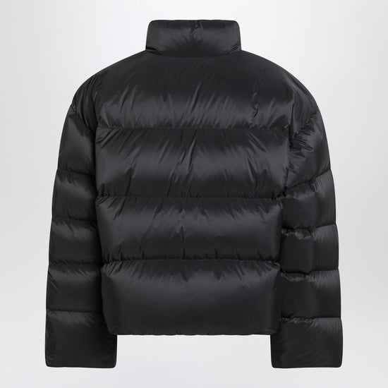 Balenciaga lightweight matte black nylon puffer jacket, featuring cocoon volume, straight high collar, concealed zip closure with snap button placket, two slanted zip pockets, drawstring hem and loop sports icon motif on the chest. size and fit - model wears size l model measurements: height: 189 cm chest: 104 cm waist: 78 cm hips: 95 cm