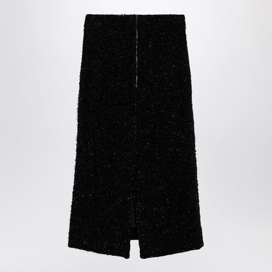 Black cotton blend tweed midi skirt from balenciaga featuring shiny threads, a rear slit, a back zip fastening and an asymmetric hemline. size and fit - model wears size m model measurements: height: 179 cm chest: 82 cm waist: 65 cm hips: 90 cm
