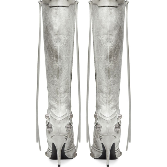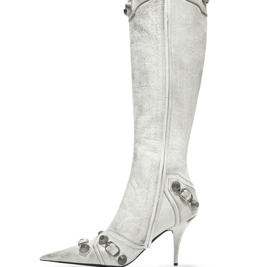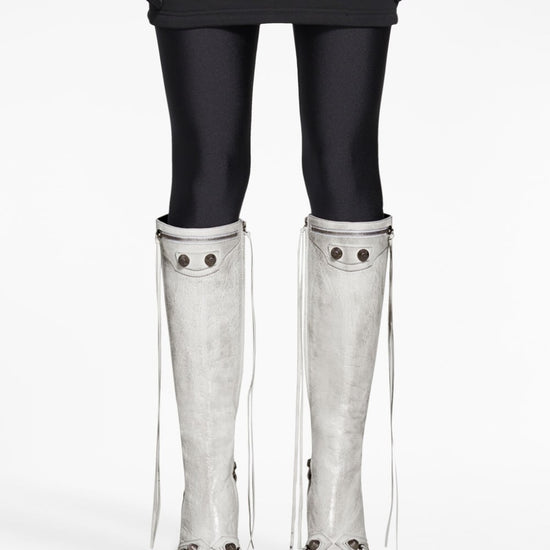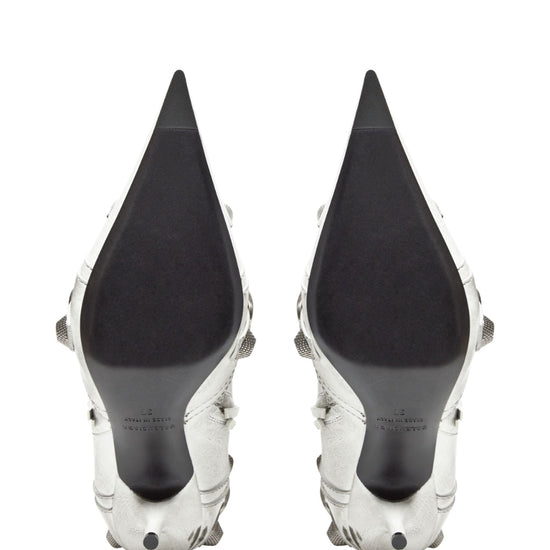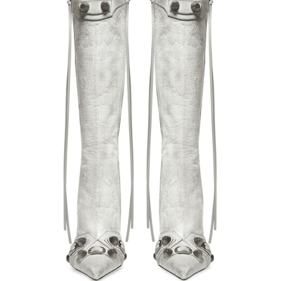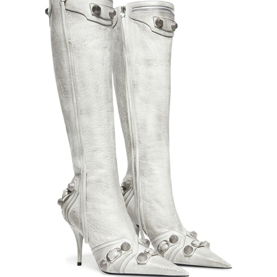 Cagole point-toe boots from balenciaga featuring optical white, lambskin, pointed toe, stud embellishment, zip details, silver-tone hardware and stiletto heel. le cagole leather boots size and fit - heel 9 cm