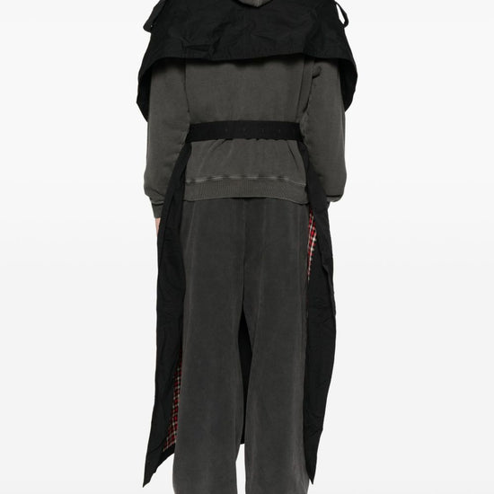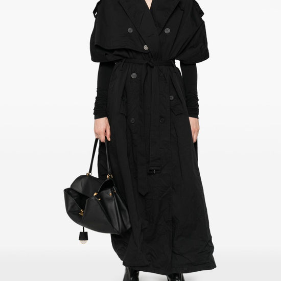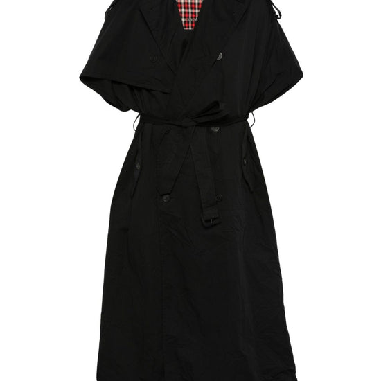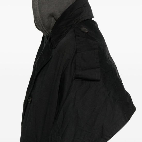 Black cotton cape sleeves double-breasted fastening belted waist classic hood cotton trench coat size and fit - length: 145.0 centimetres.