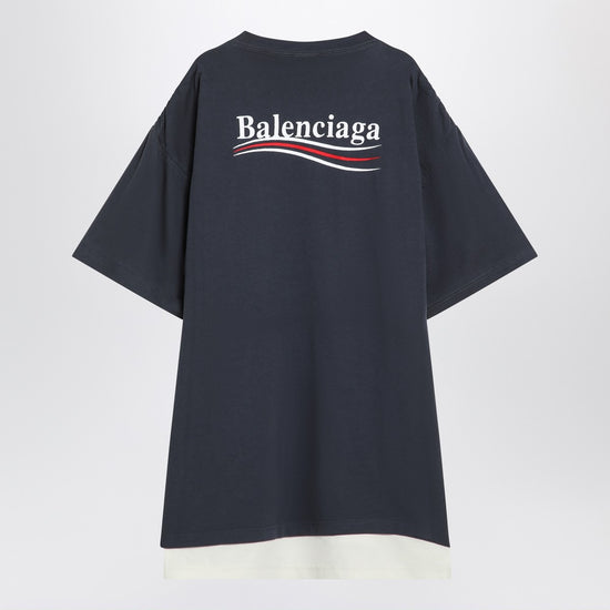 Balenciaga t-shirt in navy blue cotton jersey with a vintage effect and white, characterized by a ribbed crew neck, wide short sleeves, layered design, political campaign print on the front and back in contrast, and an oversized fit. size and fit - model wears size 3 model measurements: height: 187 cm chest: 102 cm waist: 76 cm hips: 92 cm