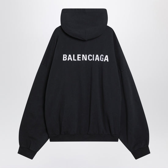 Balenciaga faded black dry fleece polo-style hooded sweatshirt, featuring a polo-style yoke collar, soft shoulders, kangaroo pocket on the front, gathered cuffs and hem, logo embroidery on front and back.